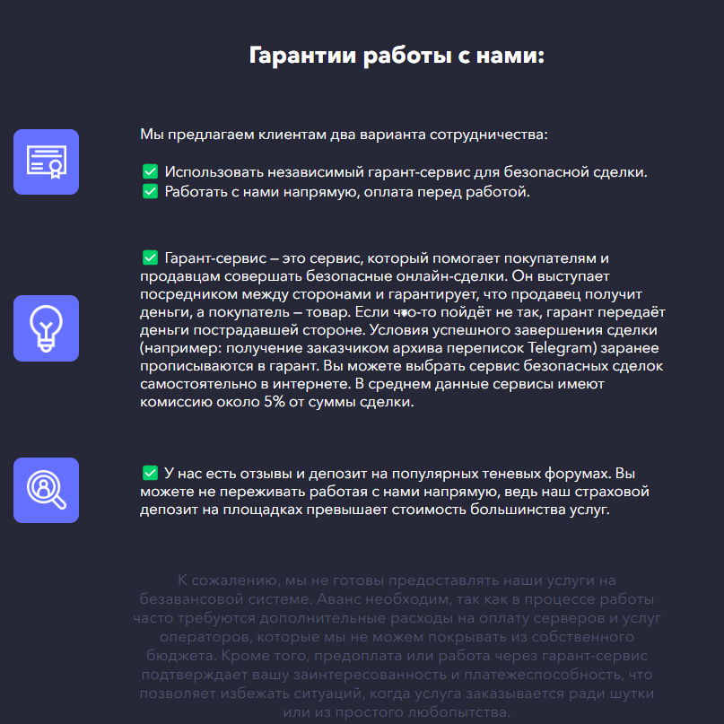 Наша компания предоставляет гарантию на доступ в течение месяца на каждый взломанный аккаунт, так как мы полностью уверены в качестве наших услуг.